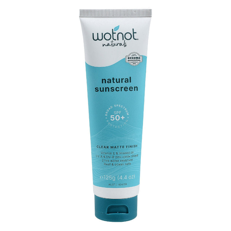 Natural Sunscreen SPF 50+ from Wotnot uses vitamin E and linseed oil to moisturise while protecting against UV-A and UV-B Rays with zinc oxide.