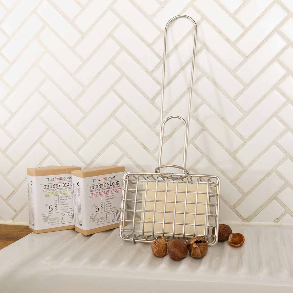 Soap cage from That Red House for waste-free dishwashing. Made from stainless steel, it holds one chunky block dishwashing soap bar.